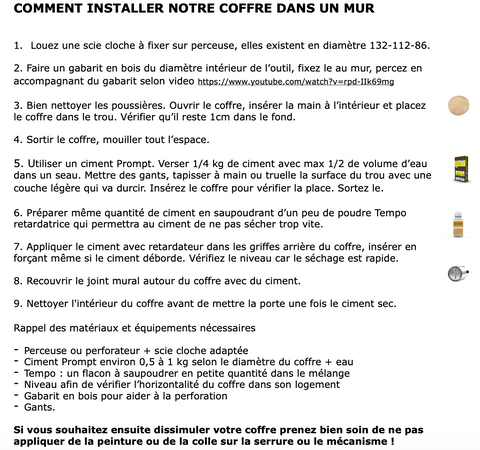 A l'intérieur placez devant le coffre un objet d'occultation que vous aurez choisi pour le cacher.. Pourquoi pas derriere une applique murale, dans un conduit d'évacuation, il existe des possibilités infinies et puis si vous souhaitez le placer à l'extérieur vous pouvez également le rendre étanche grâce à des bouchons filetés à placer sur un tuyau d'évacuation, il en existe de tous les diamètres !